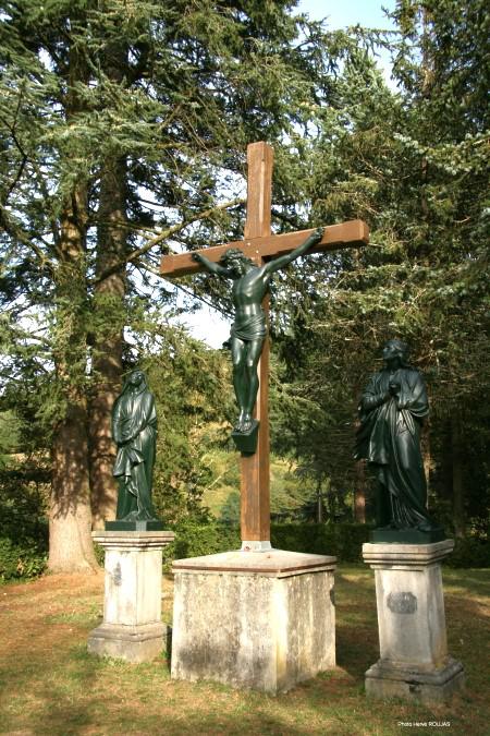 Ici la représentation du calvaire est réduite à l’essentiel : trois statues en ronde-bosse reposant sur un socle représentent le Christ en croix encadré de la Vierge et saint Jean .