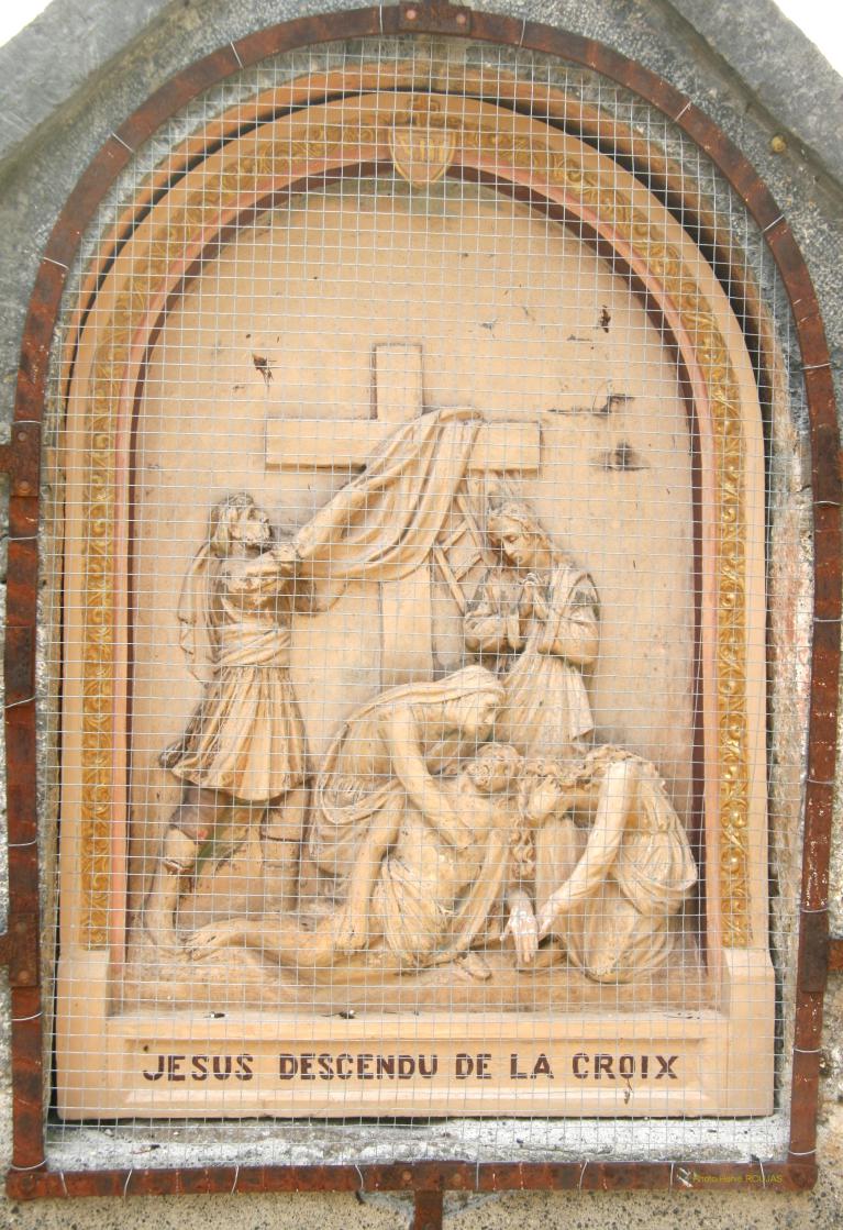 Face à cette représentation se trouve la XIIIème station «Jésus descendu de la croix», la XIVème « La mise au tombeau » se trouvant à droite des marches montant à la chapelle.