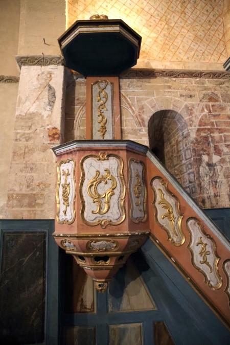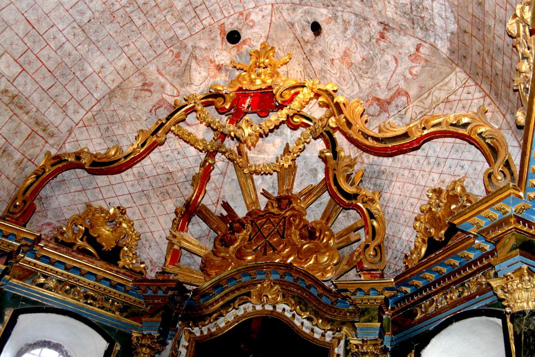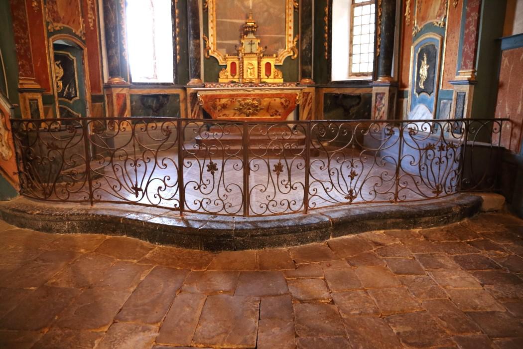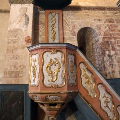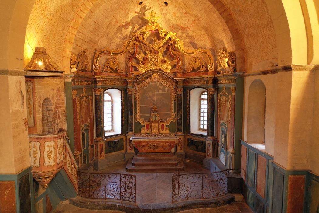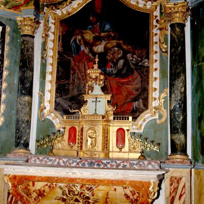 A l’intérieur le chœur est paré d’un bel ensemble de boiseries du XVIIIème de style classique, couronné d’un baldaquin aux lignes baroques.