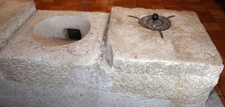 Elle renferme un instrument de mesure en pierre servant à calculer le volume de grains et non le poids.